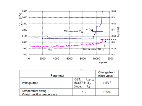IEC60749-34描述了可(ke)靠性實(shi)驗電路連接(jie)的方(fang)法,而IEC60747-9描述了IGBT參數的測試方(fang)法,以及失效標準的判(pan)據。對于功率(lv)循環,如果器件(jian)的導(dao)通(tong)壓降(jiang)超過(guo)初始值的5%或(huo)者熱阻超過(guo)初始值的20%,即判(pan)定(ding)為失效。