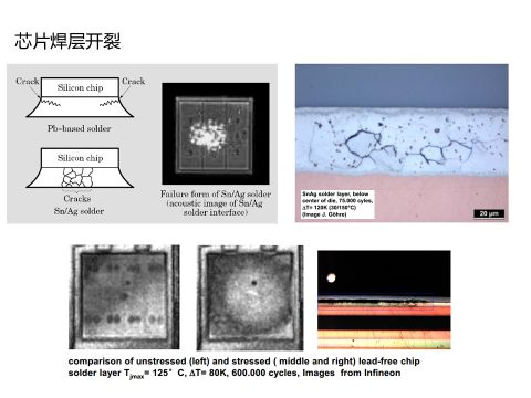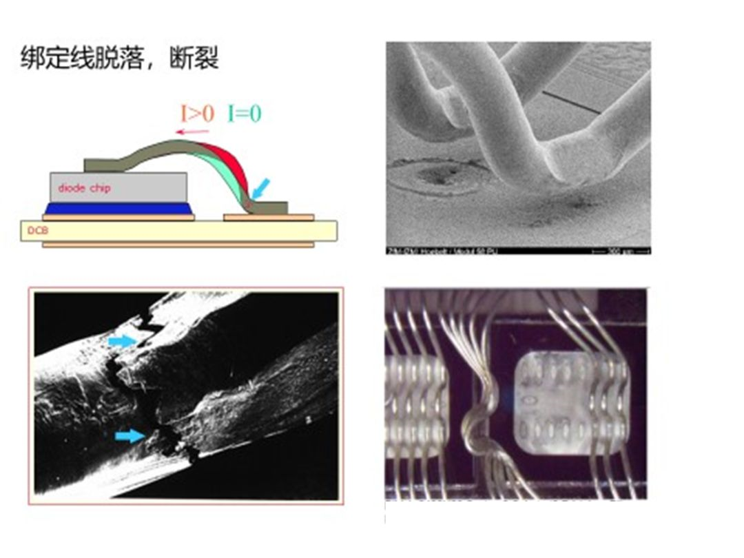 功率循(xun)環對IGBT模塊損傷的機理,主(zhu)要是(shi)銅綁定線熱(re)膨脹系數與芯片表面鋁層熱(re)膨脹系數不同(tong),芯片熱(re)膨脹系數與DBC板不同(tong)導(dao)致的。損傷的結(jie)果主(zhu)要是(shi)綁定線脫落,斷裂,芯片焊層分離。