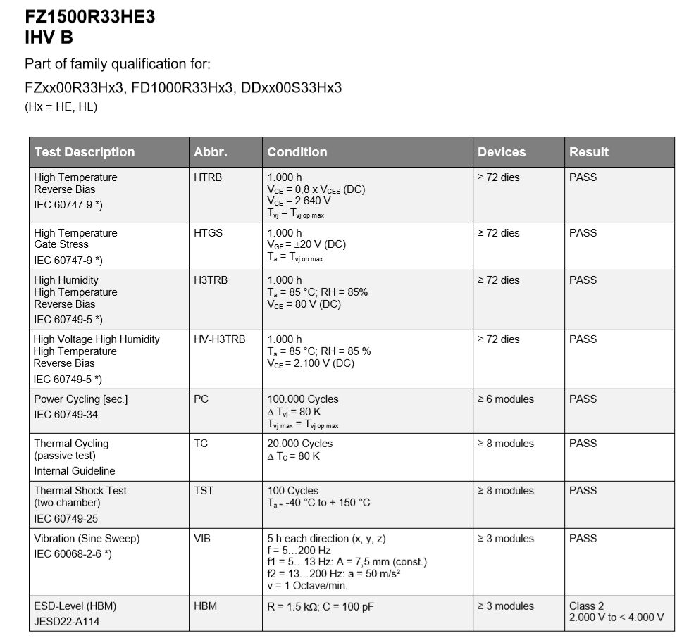 這出自一份英飛凌關于3300V IHV-B封裝產品系列的產品認證報告Product Qualification Report。這個報告里的測試項目,除了ESD靜電測試以外,都是和IGBT模塊的壽命相關的。壽命相關測試可以分成兩部分,一部分是對于芯片本身壽命的考核,另一部分是對機械連接的考核。其中對芯片本身壽命的考核有如下內容: