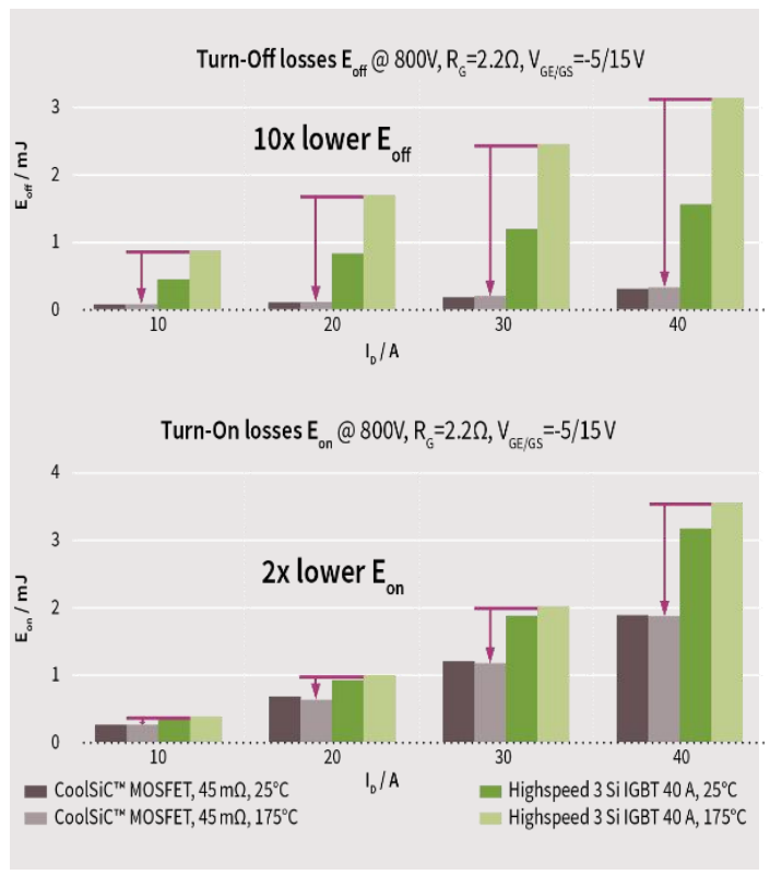 圖(tu)2. 英飛凌45mΩ 1200V CoolSiC? MOSFET和40A 1200V IGBT在同等條件(jian)下測試的(de)開(kai)關(guan)損耗對(dui)比
