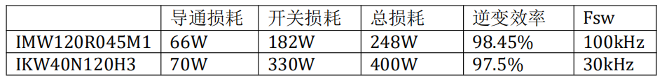 表(biao)1. 英飛(fei)凌45mΩ 1200V CoolSiC? MOSFET和40A 1200V IGBT在不同開關頻率下的(de)損耗對比(bi)