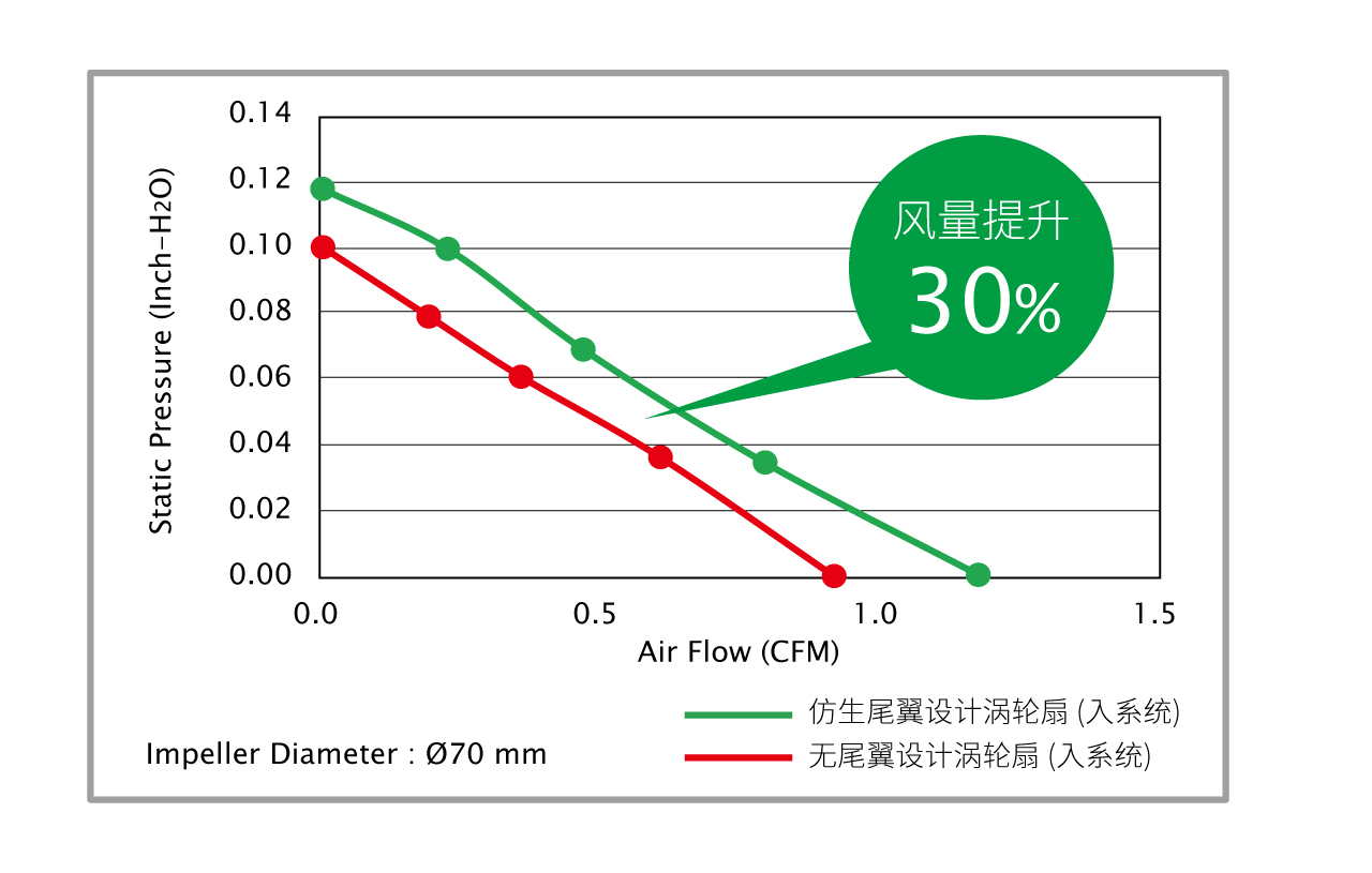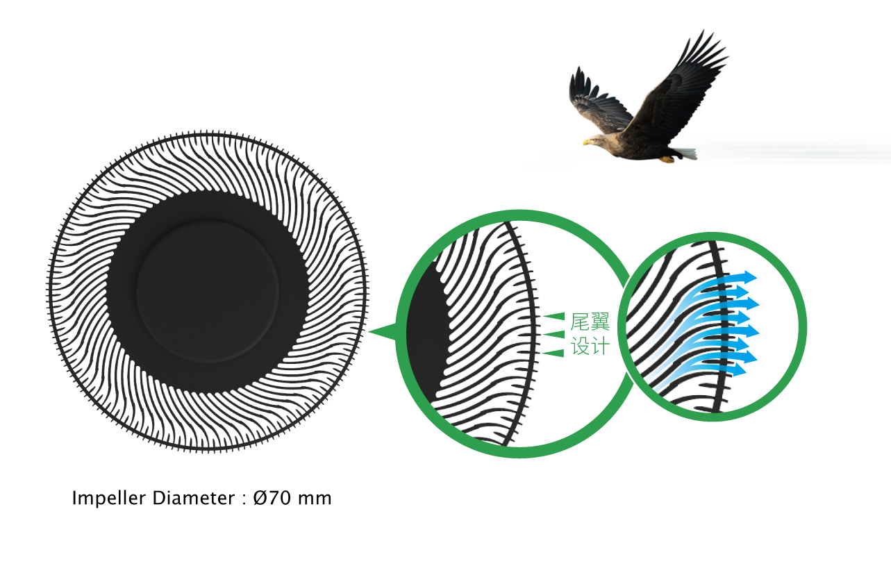 建準薄型渦輪扇系列導入專利仿生尾翼設計,增加風速、控制風流方向,讓超薄風扇發揮最大效能。建準渦輪扇葉仿生尾翼設計,靈感來自鷹鳥飛行的尾羽;鳥類的翅膀是飛行的動力,羽尾則是控制飛行的舵,鳥類尾羽的形狀與結構決定鳥的飛行速度和靈活性,建準在超薄渦輪扇葉末端導入尾翼設計,透過尾翼片控制渦輪扇運轉時的氣流方向,同時消彌扇葉末端常見的渦流現象,讓風扇氣流更順暢,達到提高風速與將渦流低噪音的效果。以渦輪扇尺寸? 70 mm 的風扇為例,導入仿生尾翼設計,控制在相同噪音,風量可提高30%,為超薄筆電提供最強大的散熱效果。