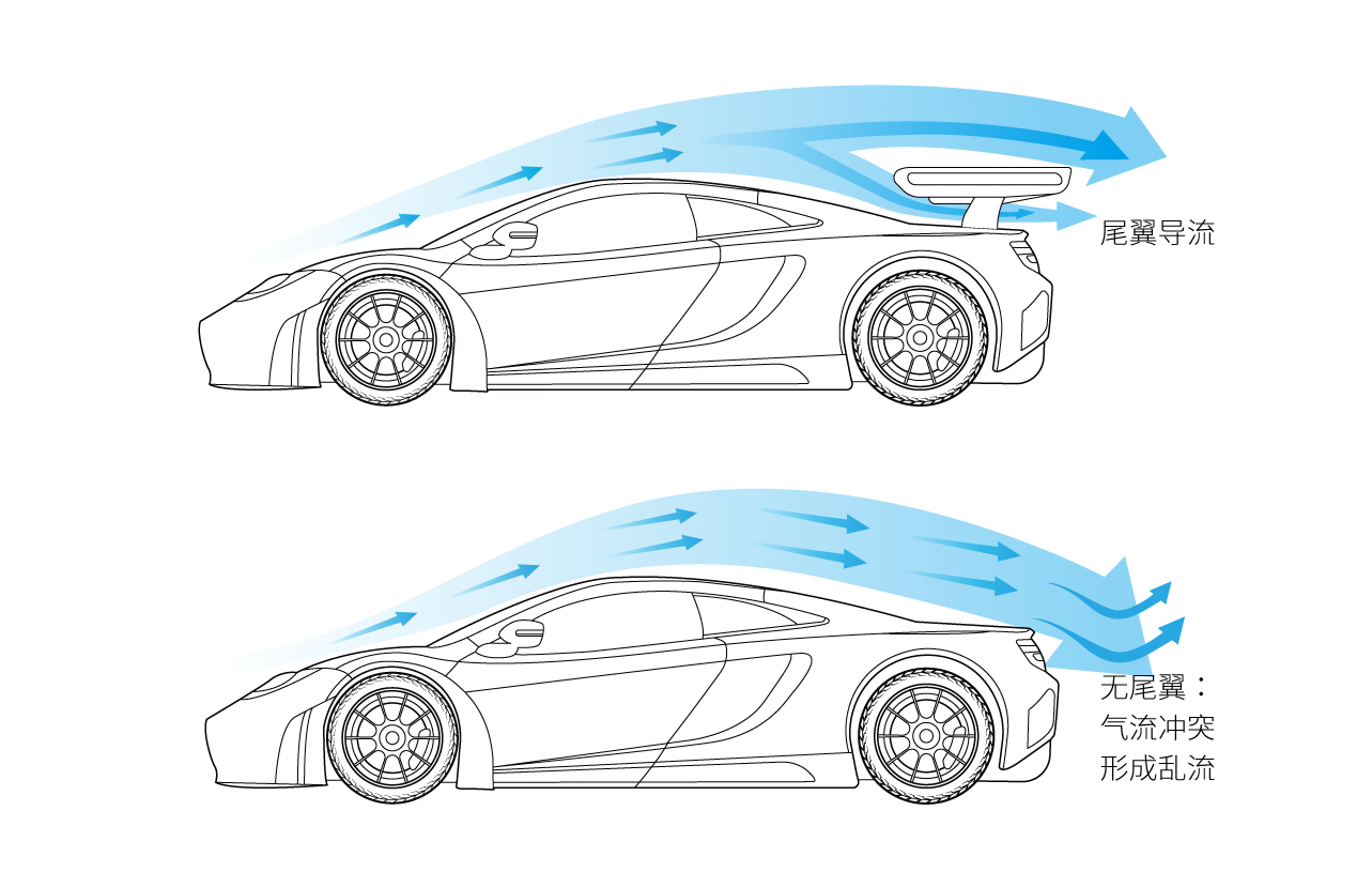 建準渦輪扇仿生尾翼設計靈感是來自鷹鳥飛行的尾羽。鳥類的翅膀是飛行的動力,羽尾則是控制飛行的舵,尾羽的形狀與結構決定鳥的飛行速度和靈活性。鳥類尾翼應用于生活科技中,以下圖汽車尾翼為例,當氣流流經尾翼后,尾翼改變了原本向下的氣流,根據力的相互作用原理,尾翼給了氣流向上的力,氣流給尾翼施加了一個向下的力,讓氣流更順暢,讓車體能平穩的高速行駛。