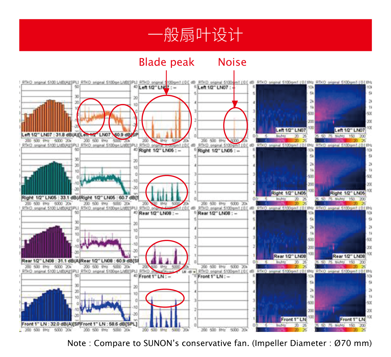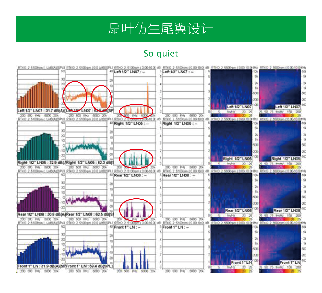 建準渦輪扇葉間的尾翼設計,改變氣流,能有效增加氣流速度,經仿真流場分析,建準仿生尾翼設計的渦輪扇的高速區范圍明顯較一般風扇設計的范圍大;同時,仿生尾翼設計可減少氣流間相互干擾現象,降低擾流所產生的噪音,透過聲音質量分析(如下圖2),建準仿生尾翼渦輪扇在相同轉速下更安靜。