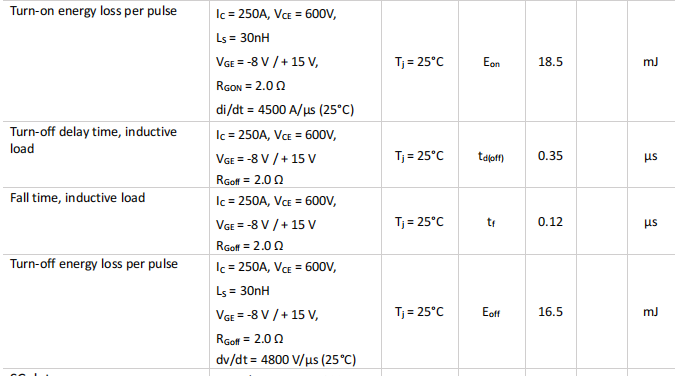 關斷損耗:Eoff=18.5mj@Ic=250A,Vce=600V,Tj=25℃
