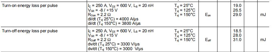 開通損耗:Eon=19mj@Ic=250A,Vce=600V,Tj=25℃