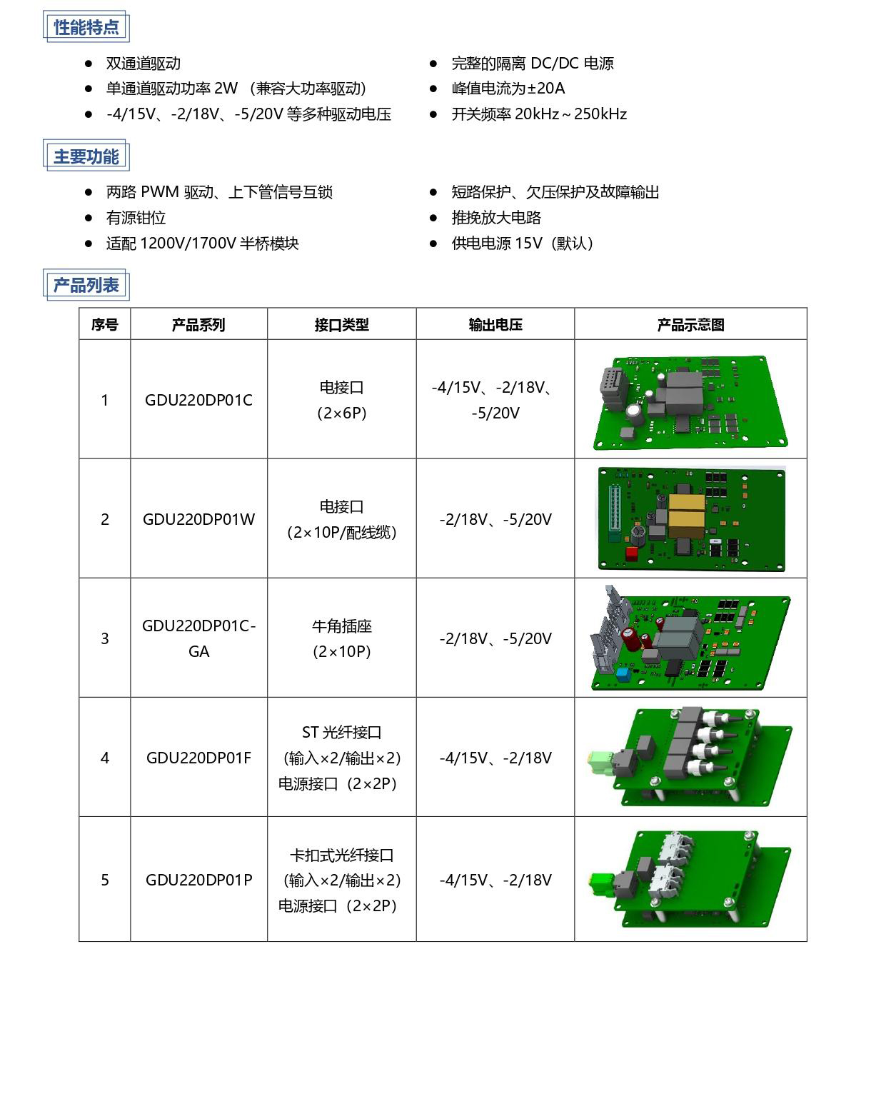GDU220DP01系列驅動板應(ying)用于PMED3(Econodual)封裝SiC MOSFET模(mo)塊,該驅動器具有完(wan)整的(de)隔(ge)離(li)電源(yuan)及完(wan)善的(de)保護功能,配置多種接口(kou)類型。