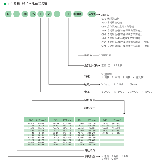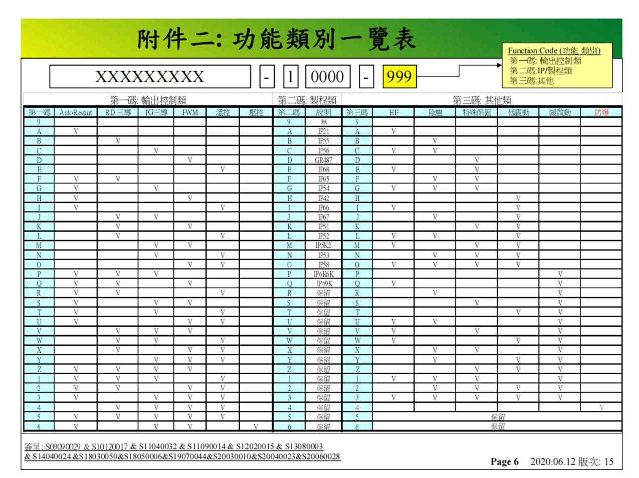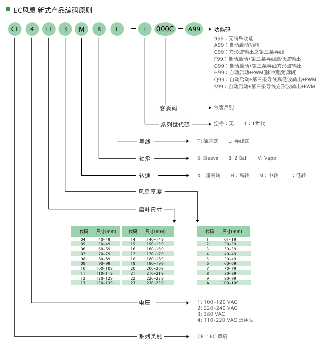 說(shuo)明:功能碼 第二位表示(shi)風(feng)扇防塵防水等(deng)級(ji) 9表示(shi)不帶(dai)防護,A表示(shi)帶(dai)IP21,B表示(shi)帶(dai)IP55,C表示(shi)帶(dai)IP56,E表示(shi)帶(dai)IP68,D表示(shi)帶(dai)GR487 防鹽霧。