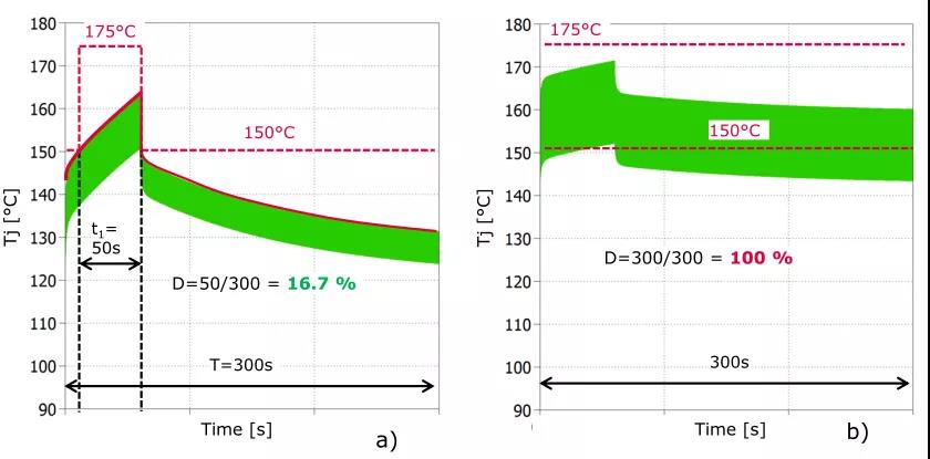 圖1中所示的最(zui)高溫度定(ding)義(yi)應被視為最(zui)高結溫(Tvjop)極限值,包括由基本輸出頻率引起的(de)(de)溫(wen)(wen)(wen)度(du)波動。圖(tu)2提供了兩(liang)個(ge)結(jie)溫(wen)(wen)(wen)曲線的(de)(de)示例(li)。在圖(tu)2a中(zhong),周期(qi)時間(jian)(jian)T=300s,最(zui)(zui)高結(jie)溫(wen)(wen)(wen)超(chao)過(guo)150℃的(de)(de)持續時間(jian)(jian)t1=50s。剩余時間(jian)(jian)內,結(jie)溫(wen)(wen)(wen)都低于(yu)150°C。因(yin)此,占(zhan)空比為16.7%。從最(zui)(zui)高運行(xing)結(jie)溫(wen)(wen)(wen)的(de)(de)角度(du)來看(kan),這(zhe)(zhe)種工況(kuang)是(shi)(shi)允許的(de)(de)。另一(yi)個(ge)示例(li)如圖(tu)2b所(suo)示。在本例(li)中(zhong),最(zui)(zui)高結(jie)溫(wen)(wen)(wen)在整個(ge)負載周期(qi)時間(jian)(jian)內都超(chao)過(guo)150°C。這(zhe)(zhe)種工況(kuang)是(shi)(shi)不能允許的(de)(de)。
