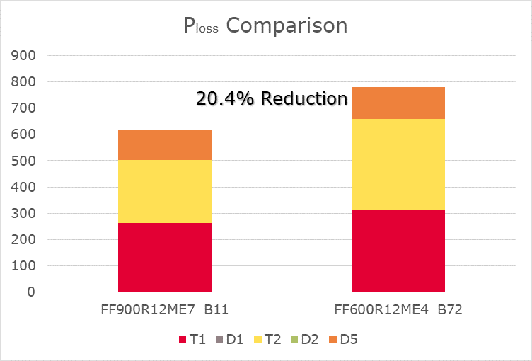 在如下光伏應用的典型工況下:母線電壓1170VDC,開關頻率2.4kHz,輸出電流400A,PF=1我們做了仿真,如圖5所示。從仿真結果可以看出,相對于原來的600A模塊,采用900A模塊可以將系統的模塊總損耗降低20.4%。損耗的降低不僅可以減小客戶的系統散熱成本,還提高了光伏逆變器的轉換效率。