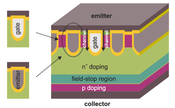 FF900R12ME7_B11采用了英飛凌的第七代IGBT晶圓技術。IGBT7采用了微溝槽(Micro Pattern Trench)結構, 如圖2所示。與IGBT4相比其靜態損耗顯著降低,并且動態損耗并沒有增加。搭配全新的第七代反并聯二極管芯片—EmCon7能夠實現更干凈的開關,減小震蕩,降低損耗。
