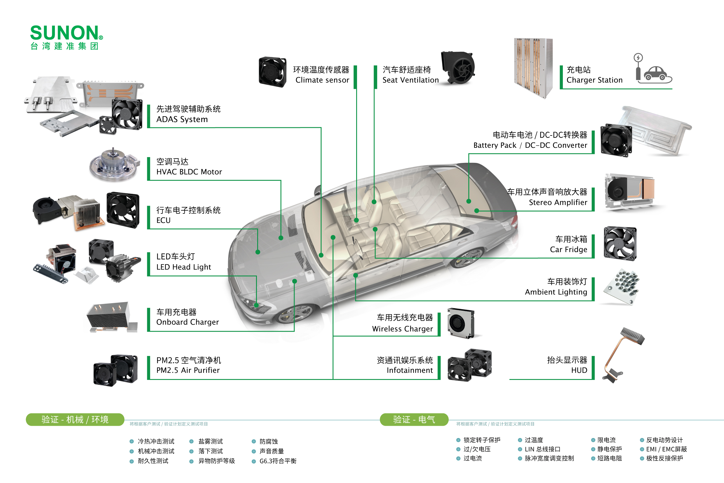 不良(liang)的散熱設計將嚴(yan)重(zhong)危及電子產(chan)(chan)品的可靠度(du)、安(an)全性、耐(nai)久性,也會在行駛(shi)中(zhong)產(chan)(chan)生不良(liang)的噪音與振動,進而影響汽(qi)車制造商的產(chan)(chan)品保固(gu)維修(xiu)與汽(qi)車質量滿意度(du)等(deng)問題。SUNON以(yi)獨創DR MagLev防(fang)阻(zu)微塵磁(ci)浮(fu)馬達風扇技術,結合高(gao)安(an)全性、高(gao)可靠度(du)、高(gao)效(xiao)能(neng)產(chan)(chan)品特色,并通過耐(nai)酸、耐(nai)鹽霧GR487驗(yan)證、1000沙漠(mo)地區測(ce)試、ESD 靜電防(fang)護等(deng)嚴(yan)苛測(ce)試,滿足客(ke)戶高(gao)質量的要(yao)求(qiu).